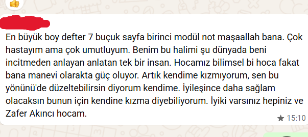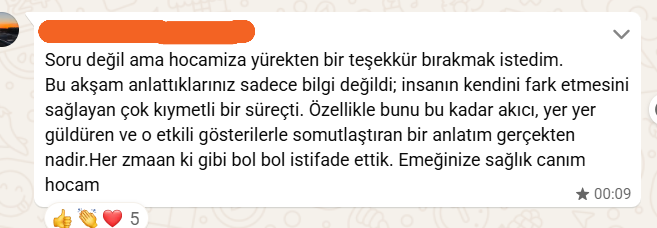 5 yaşında annesi tarafından terk edilmiş, derin travmalarının farkında olmayan bir kadındım. Bilinçaltı eğitimiyle zor bir dönemimde karşılaştım. Bu eğitim ve terapilerden önce korkuları olan, güvenemeyen, sevemeyen, şükredemeyen her sabah dayak yemiş gibi uyanan birisiydim . Sihirli değneğin varlığını gördüm. Eğitimin gerekliliklerini ve insan suretinde ki melek Zafer hocamın ödevlerini harfiyen uyguladım. Daha ilk günden " günaydın çocuklar, çiçekler açsın böcekler uçsun" sözleriyle uyandım. Kendimi, çocuklarımı, Allah'ı sevdiğimi sanıyormuşum, oysaki hiçbirimizden memnun değilmişim. Uyduruk bir kafayla değil kalbimle, ruhumla hatta tüm hücrelerimle sevmeyi, güvenmeyi, şükretmeyi öğreten bu işin zamanımızdaki piri olan hocama ve ekibine sonsuz teşekkürler