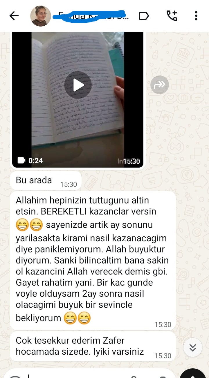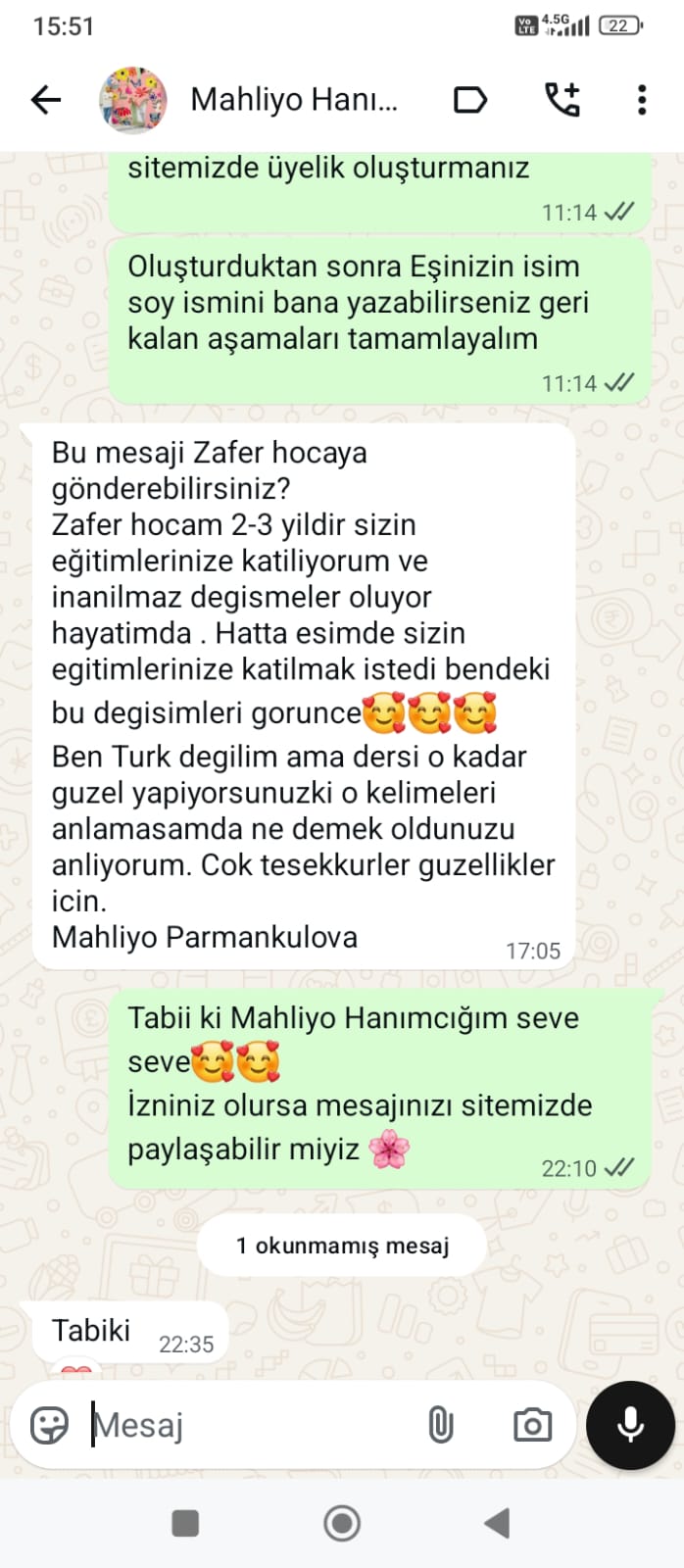 5 yaşında annesi tarafından terk edilmiş, derin travmalarının farkında olmayan bir kadındım. Bilinçaltı eğitimiyle zor bir dönemimde karşılaştım. Bu eğitim ve terapilerden önce korkuları olan, güvenemeyen, sevemeyen, şükredemeyen her sabah dayak yemiş gibi uyanan birisiydim . Sihirli değneğin varlığını gördüm. Eğitimin gerekliliklerini ve insan suretinde ki melek Zafer hocamın ödevlerini harfiyen uyguladım. Daha ilk günden " günaydın çocuklar, çiçekler açsın böcekler uçsun" sözleriyle uyandım. Kendimi, çocuklarımı, Allah'ı sevdiğimi sanıyormuşum, oysaki hiçbirimizden memnun değilmişim. Uyduruk bir kafayla değil kalbimle, ruhumla hatta tüm hücrelerimle sevmeyi, güvenmeyi, şükretmeyi öğreten bu işin zamanımızdaki piri olan hocama ve ekibine sonsuz teşekkürler